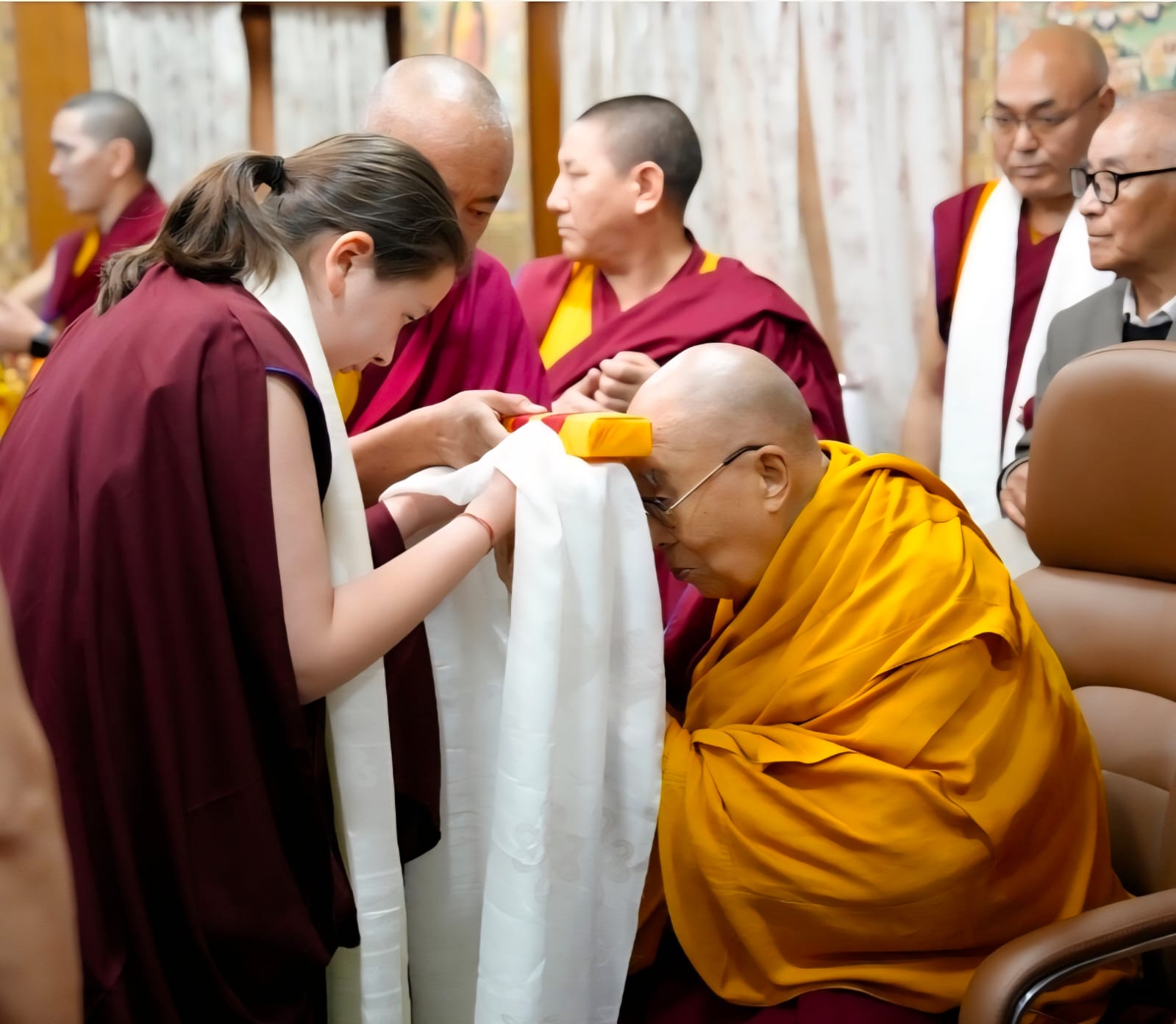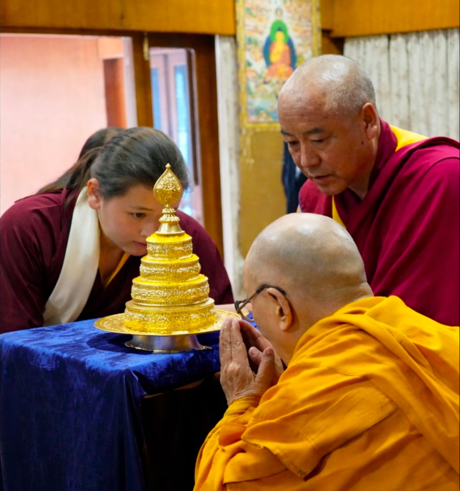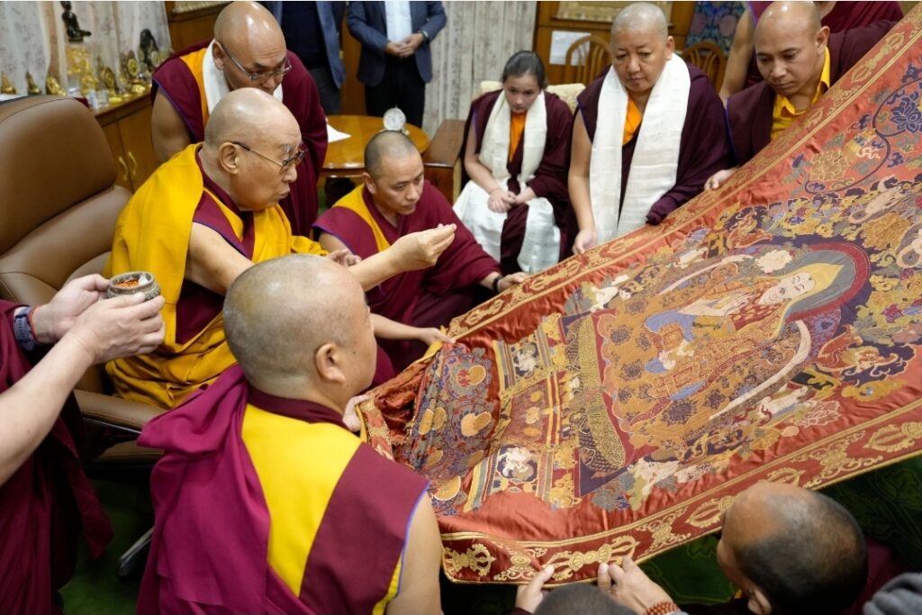 Among the offerings was a rare and precious thangka of the Great Fifth Dalai Lama, woven in silk over three centuries ago during the Qing dynasty. As one of the few remaining sacred representations of its kind, it was presented with deep reverence and joy, constituting a supreme tendrel, marking the return of a sacred image to its rightful sphere of devotion.