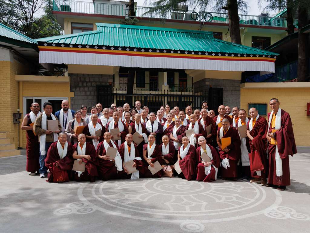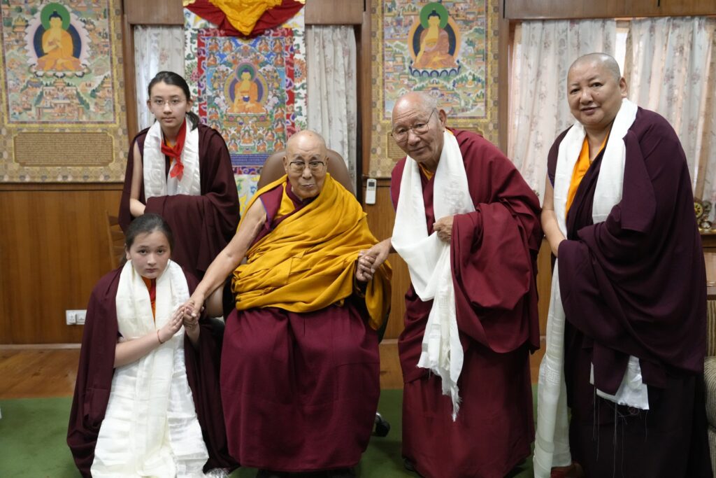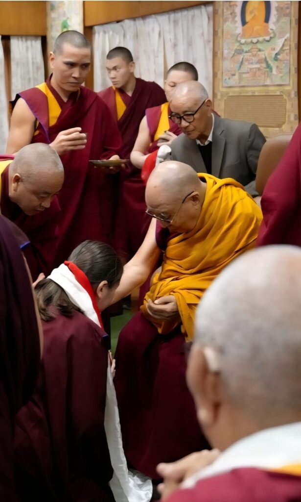 On the auspicious full moon day of the second lunar month, an event of profound blessing and historic significance unfolded. His Holiness the 14th Dalai Lama, the very embodiment of boundless compassion and wisdom, bestowed the sacred tsugphü (hair-cutting) ceremony upon Minling Dungse Rinpoche and Minling Jetsün Rinpoche. They were accompanied by Kyabje Khochhen Rinpoche, Minling Jetsün Khandro Rinpoche, Minling Sangyum Kushog, Minling Jetsün Dechen Paldrön, as well as senior khenpos, monks, nuns, and a few members of the Mindrolling Admin Europe and USA.