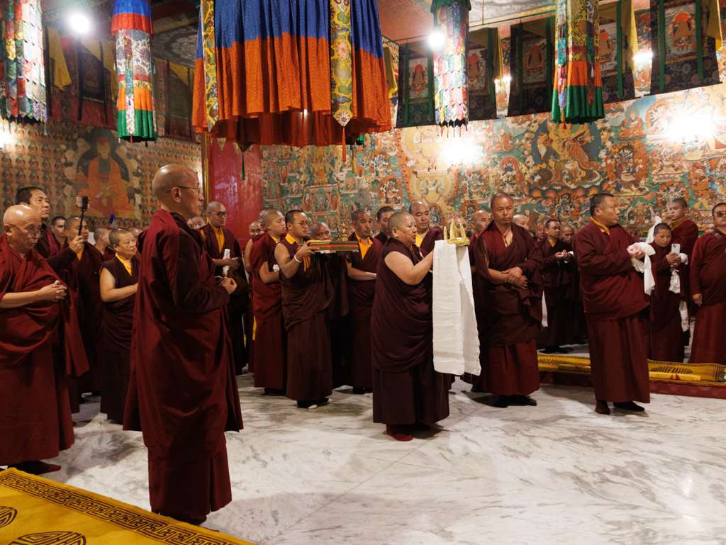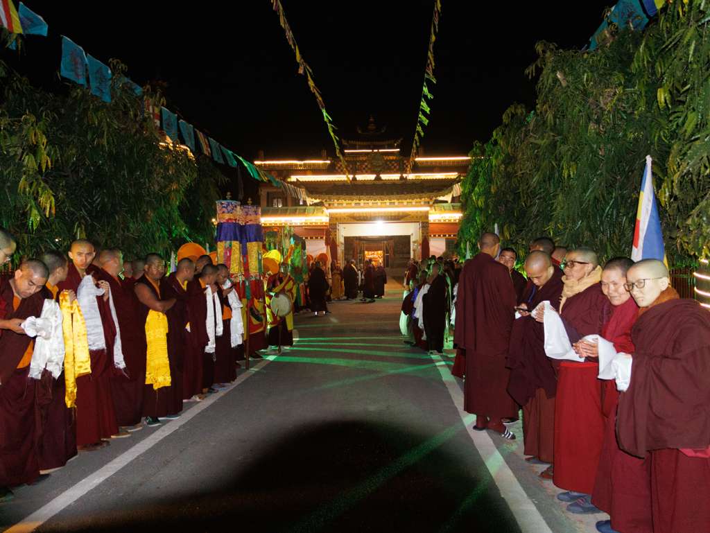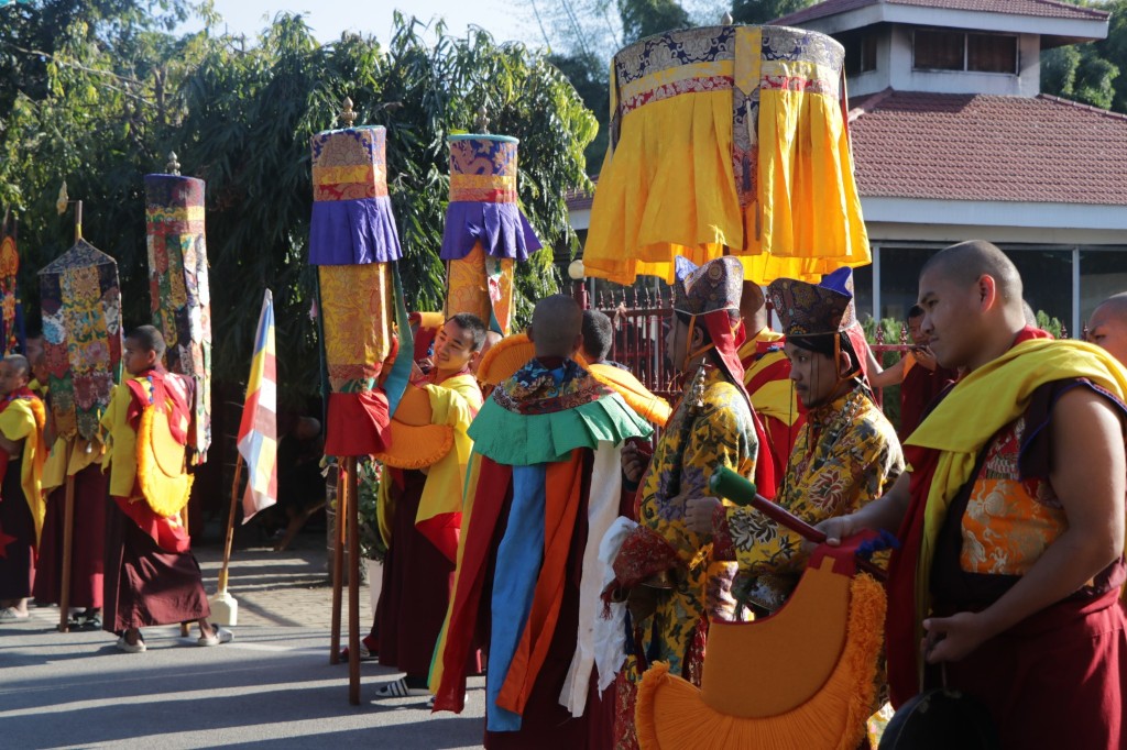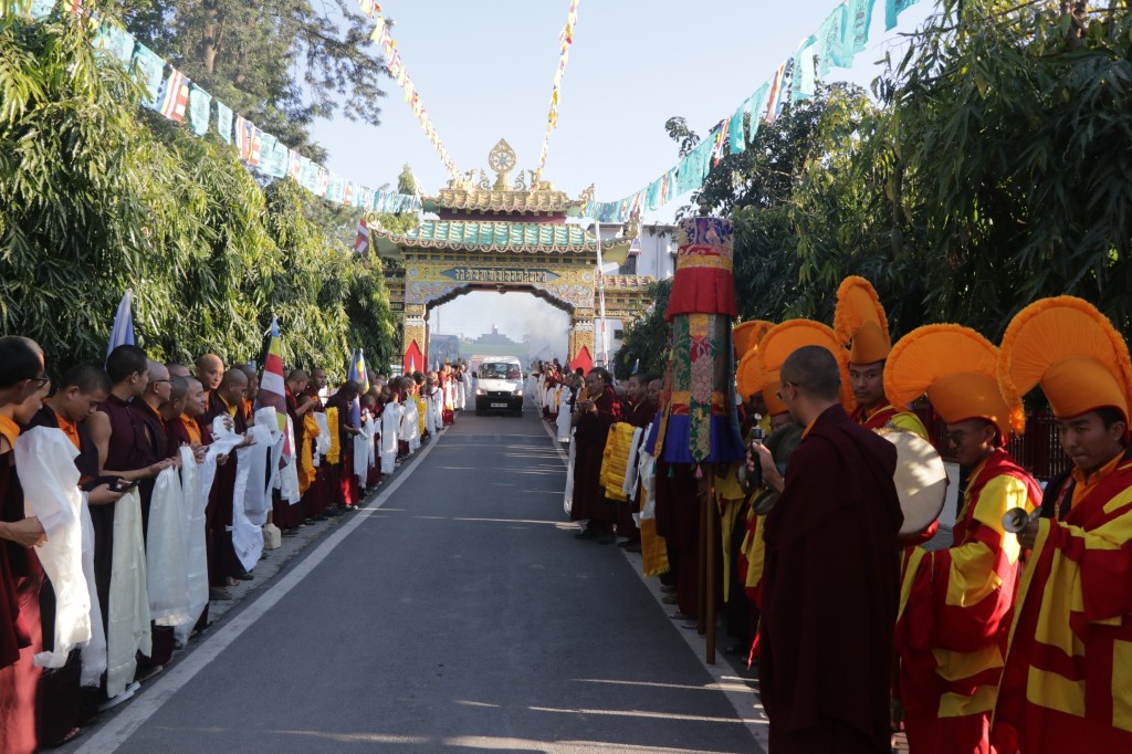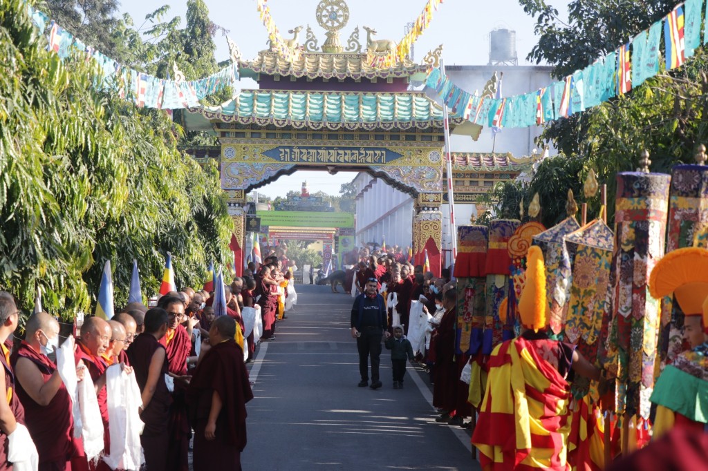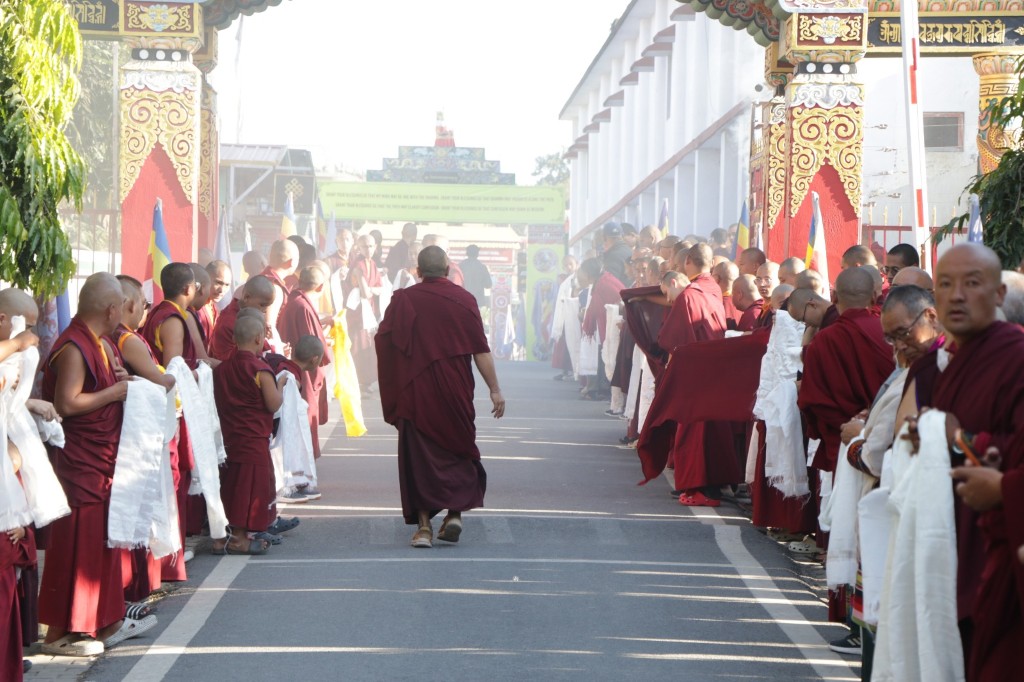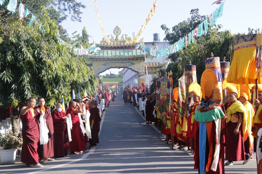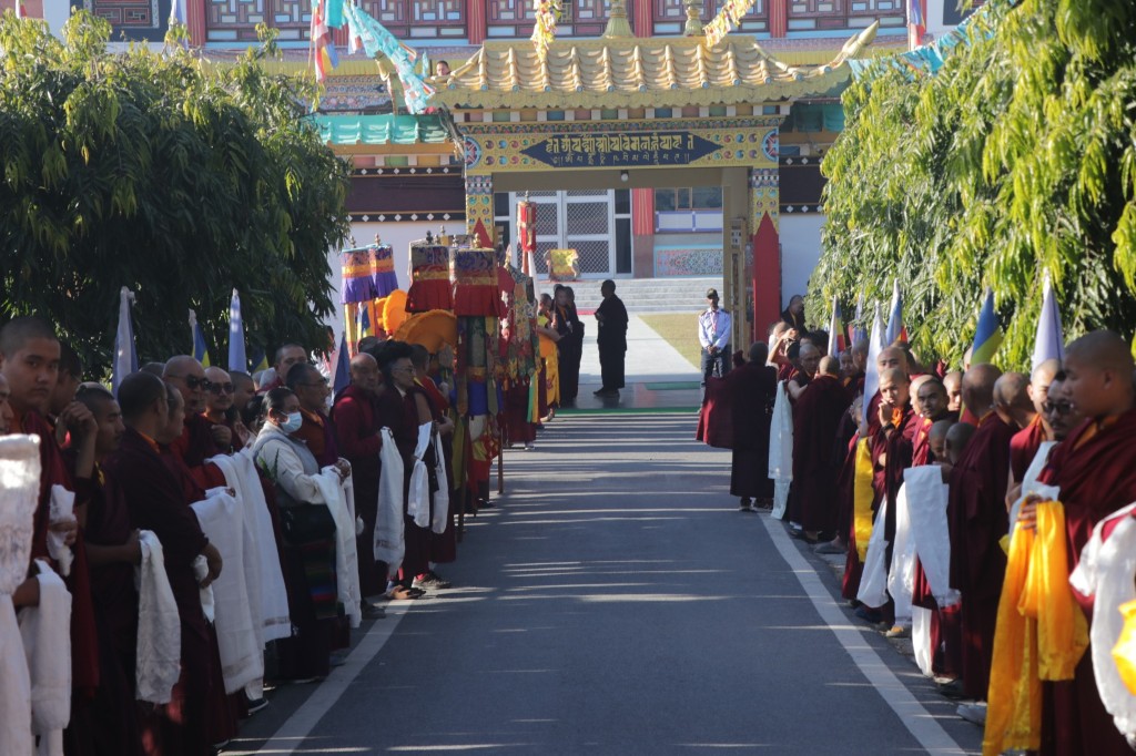 On the 7th and 8th lunar days, Mindrolling Monastery joyfully prepared to receive many rinpoches for the Nyingma Kama transmissions to be bestowed by Kyabje Shechen Rabjam Rinpoche. Each rinpoche was welcomed by the monastery and gathered assembly with a formal procession and offerings of mandala and khatag.