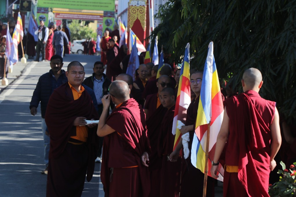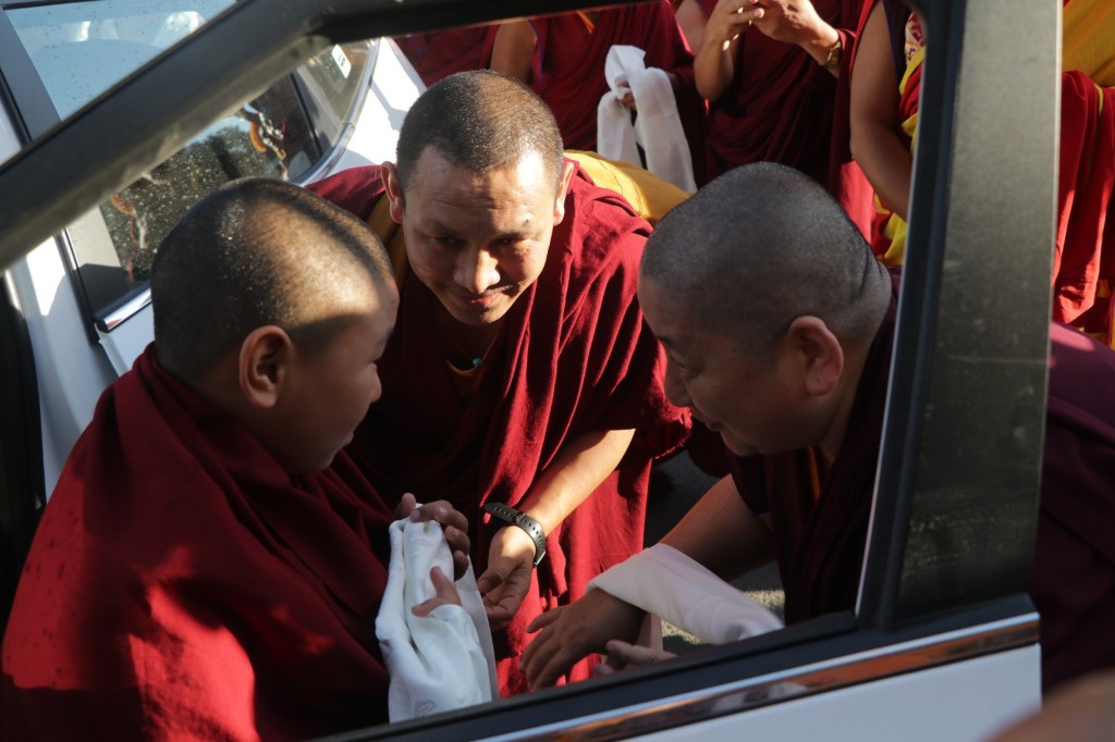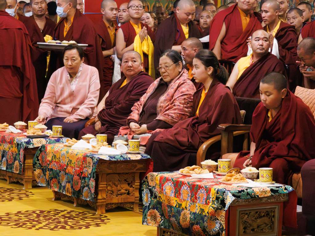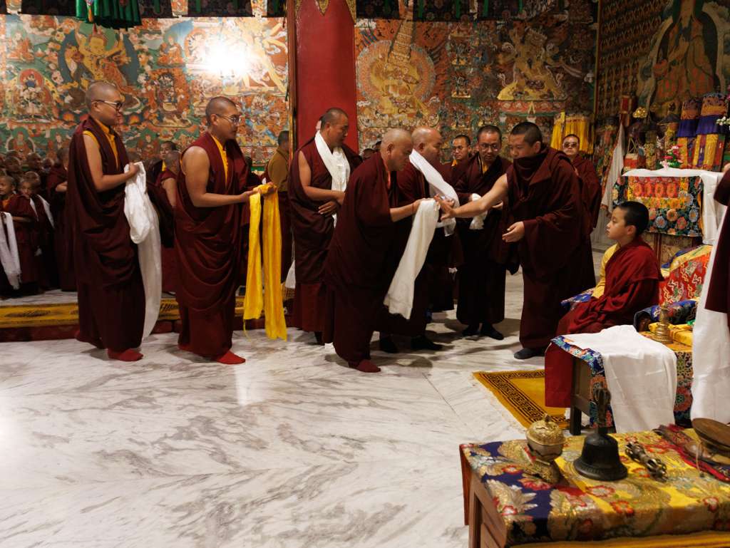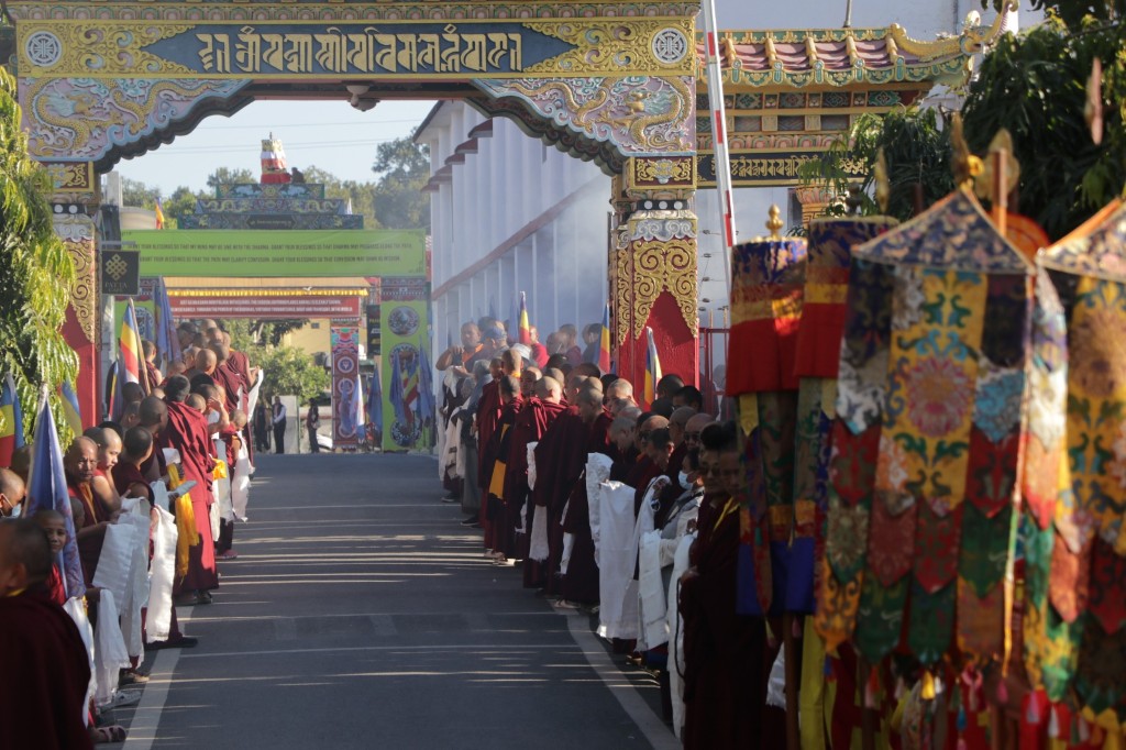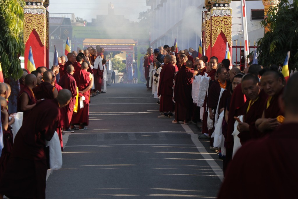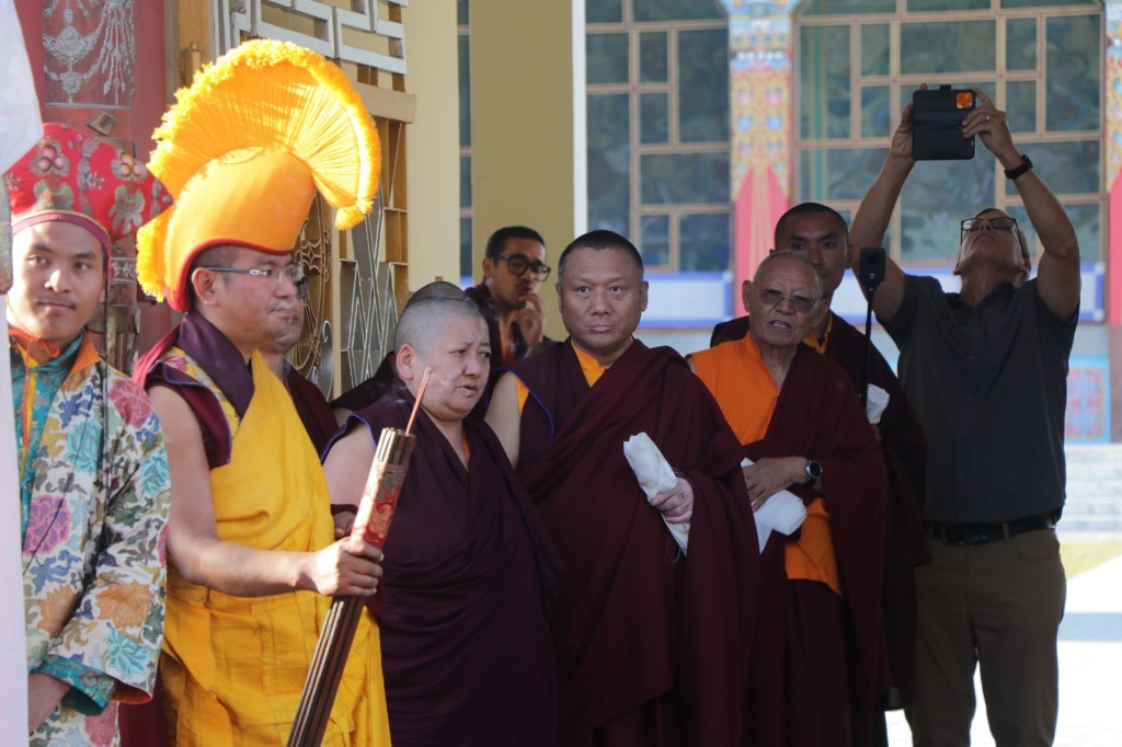On the 7th and 8th lunar days, Mindrolling Monastery joyfully prepared to receive many rinpoches for the Nyingma Kama transmissions to be bestowed by Kyabje Shechen Rabjam Rinpoche. Each rinpoche was welcomed by the monastery and gathered assembly with a formal procession and offerings of mandala and khatag.