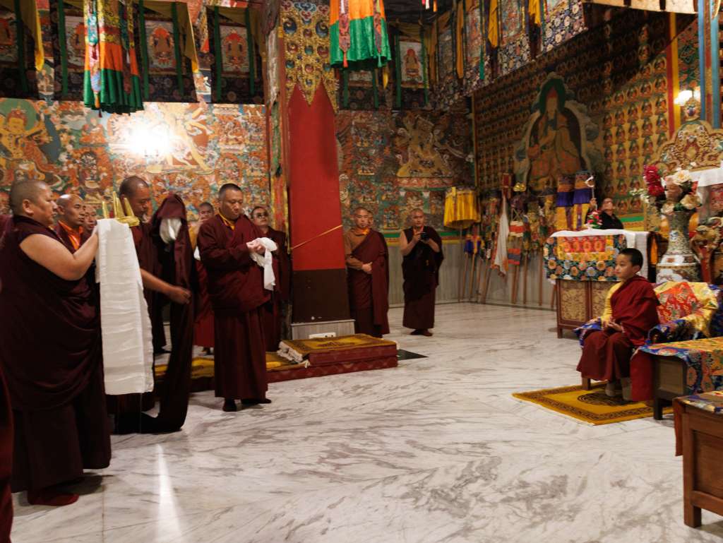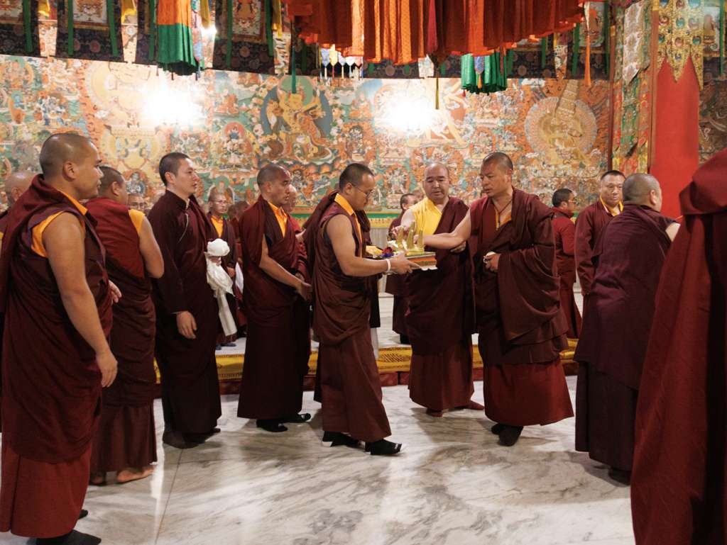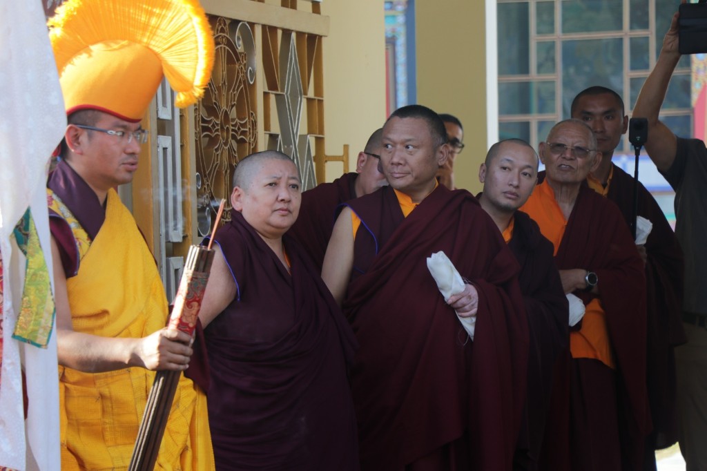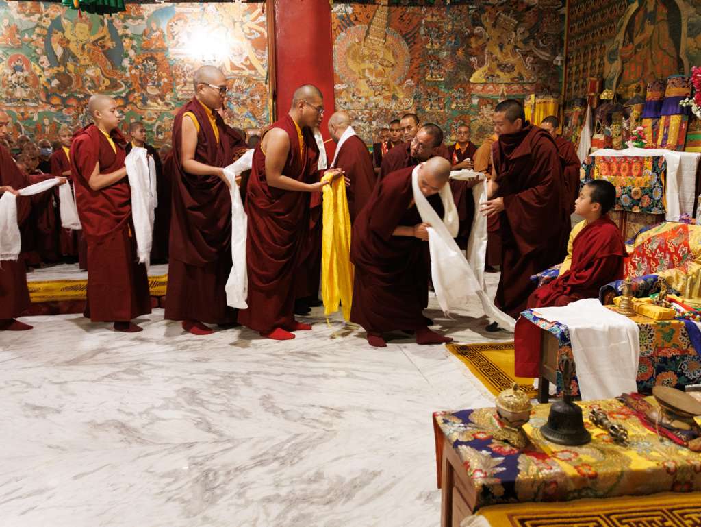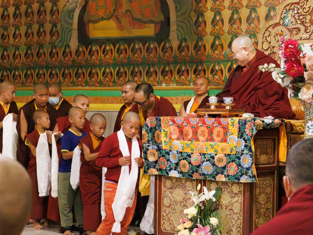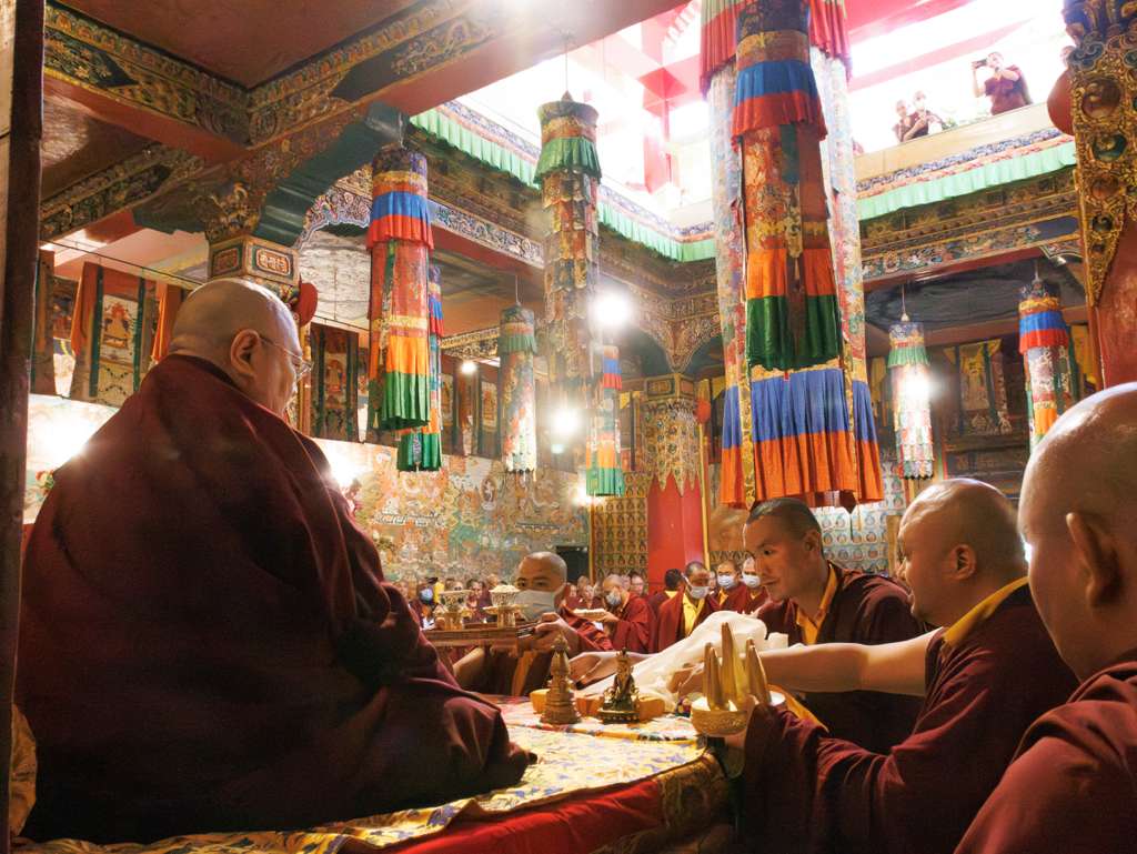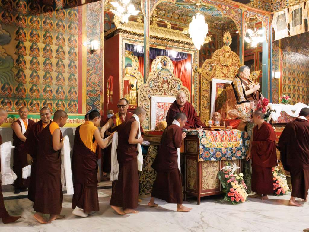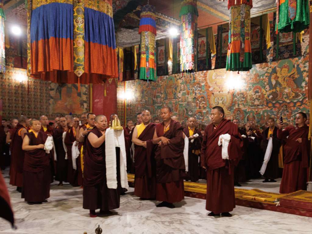 On the 7th and 8th lunar days, Mindrolling Monastery joyfully prepared to receive many rinpoches for the Nyingma Kama transmissions to be bestowed by Kyabje Shechen Rabjam Rinpoche. Each rinpoche was welcomed by the monastery and gathered assembly with a formal procession and offerings of mandala and khatag.