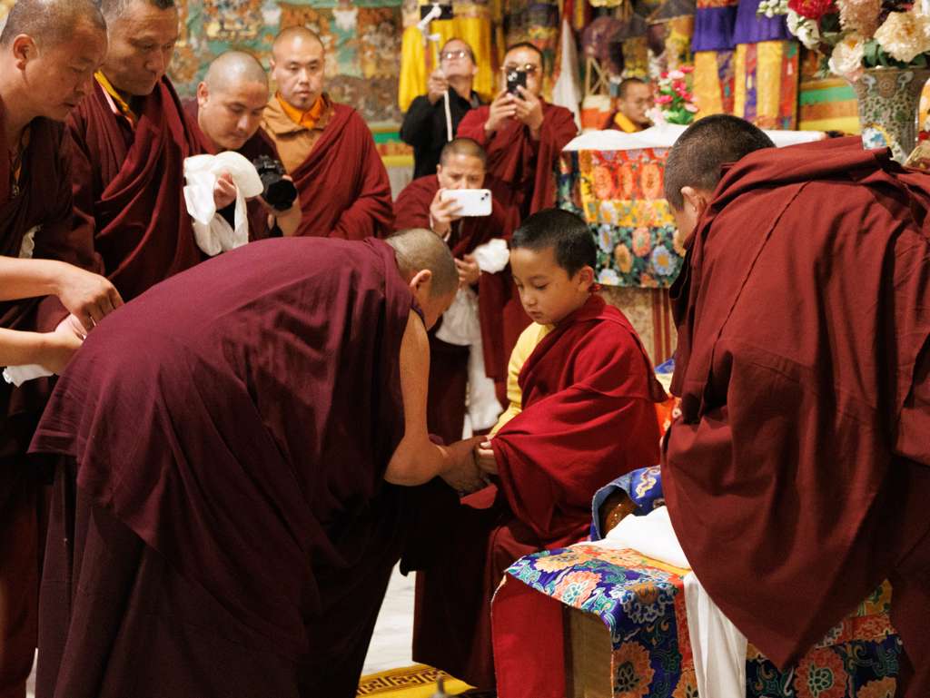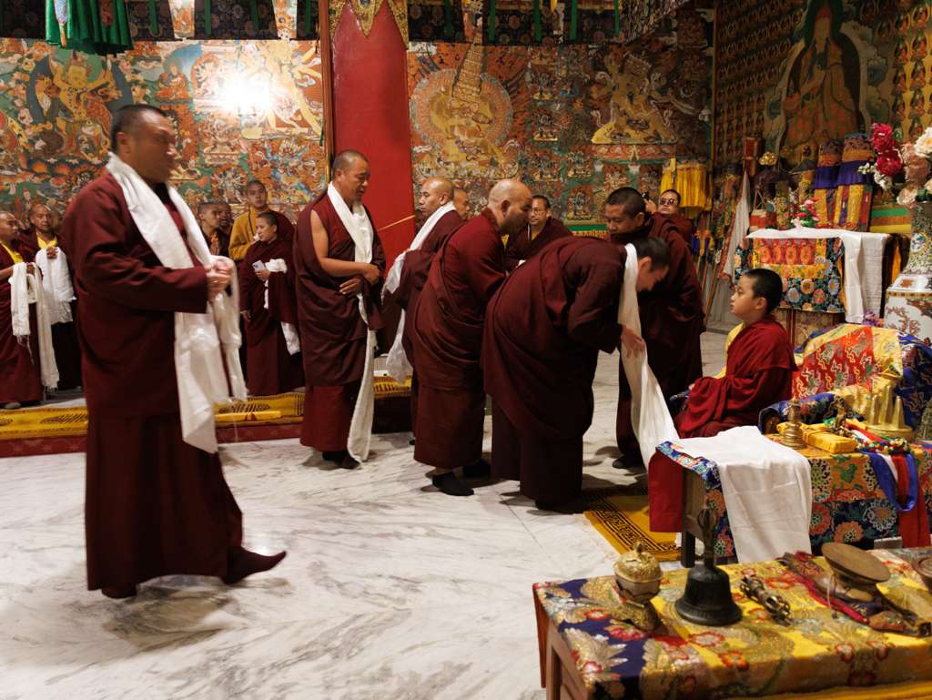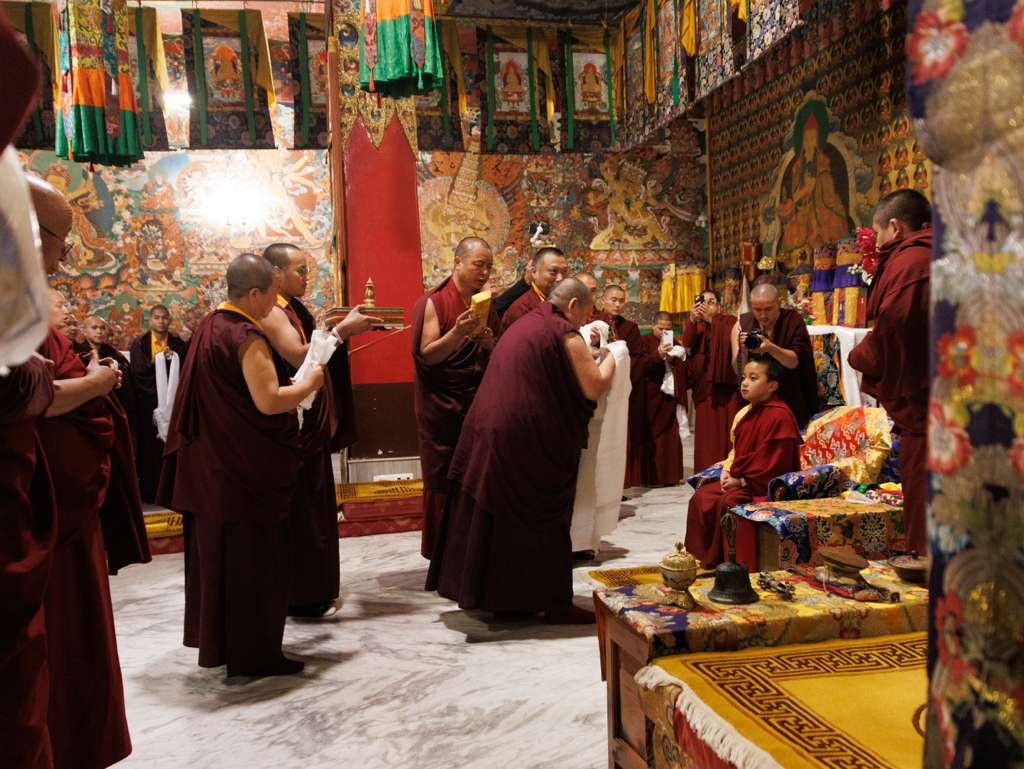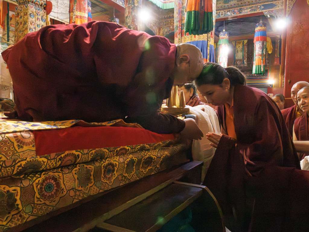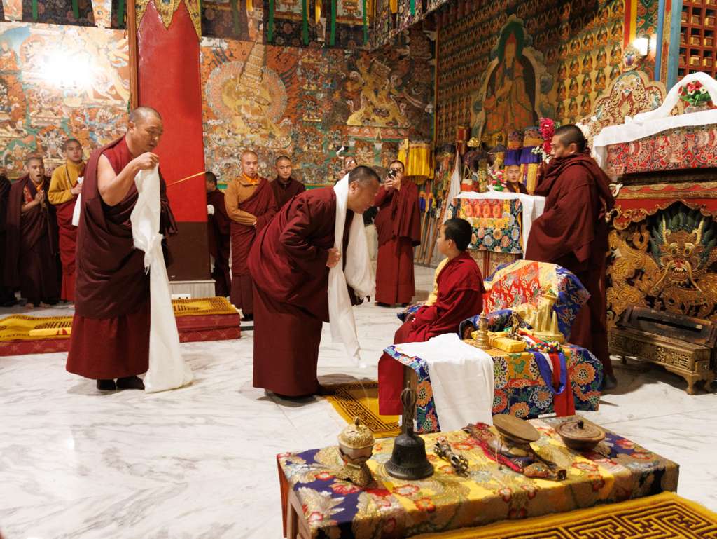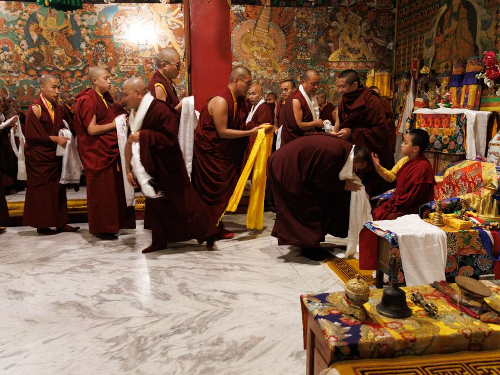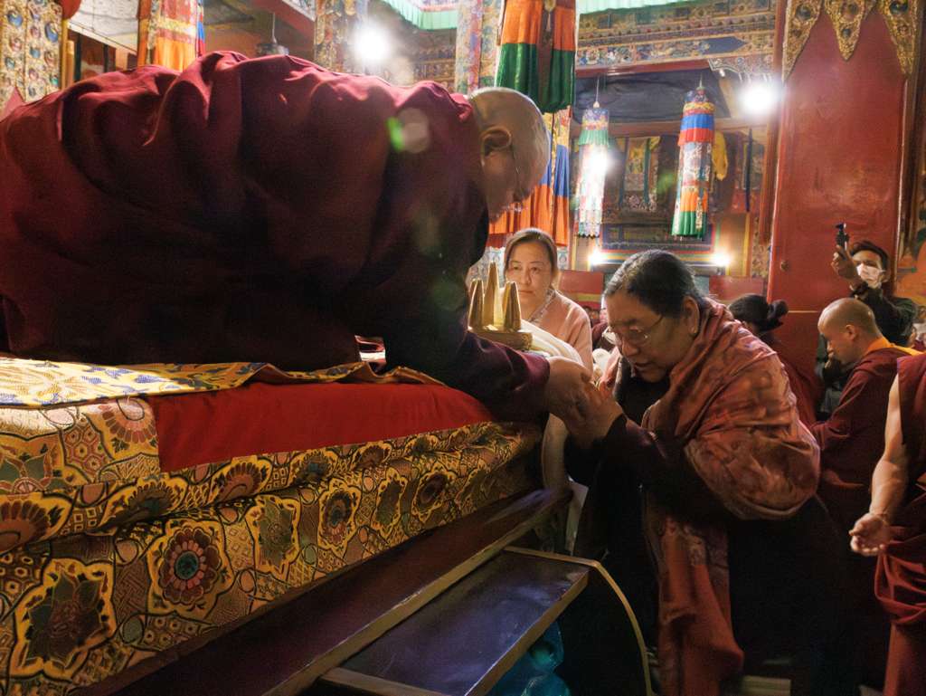 On the 7th and 8th lunar days, Mindrolling Monastery joyfully prepared to receive many rinpoches for the Nyingma Kama transmissions to be bestowed by Kyabje Shechen Rabjam Rinpoche. Each rinpoche was welcomed by the monastery and gathered assembly with a formal procession and offerings of mandala and khatag.